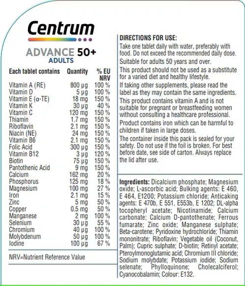 For best results, take consistently every day. Centrum Advance 50+ works alongside a healthy diet to support energy levels, immunity, and overall wellness. If you miss a dose, take it when you remember, but do not double up.